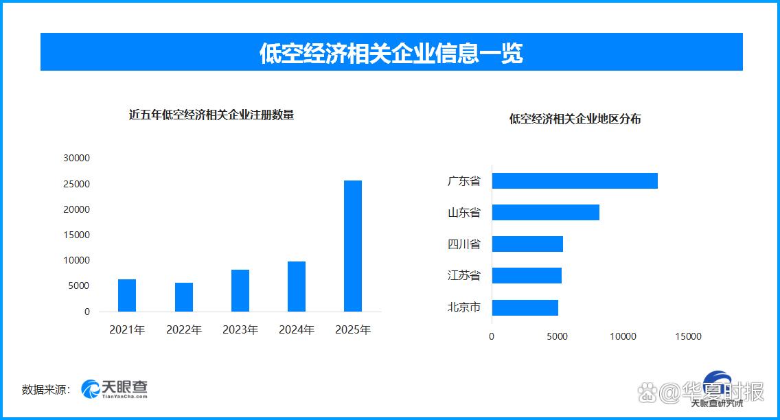 天眼查专业版工商信息数据显示,截至目前我国现存在业、存续状态的低空经济相关企业超10万家。其中,2025年新增注册相关企业超2.5万余家,从企业注册数量趋势来看,近五年间,低空经济相关企业的注册数量呈现稳步增长态势,但在2025年呈现出显著增长,同比增长达162.36%,并达到峰值。